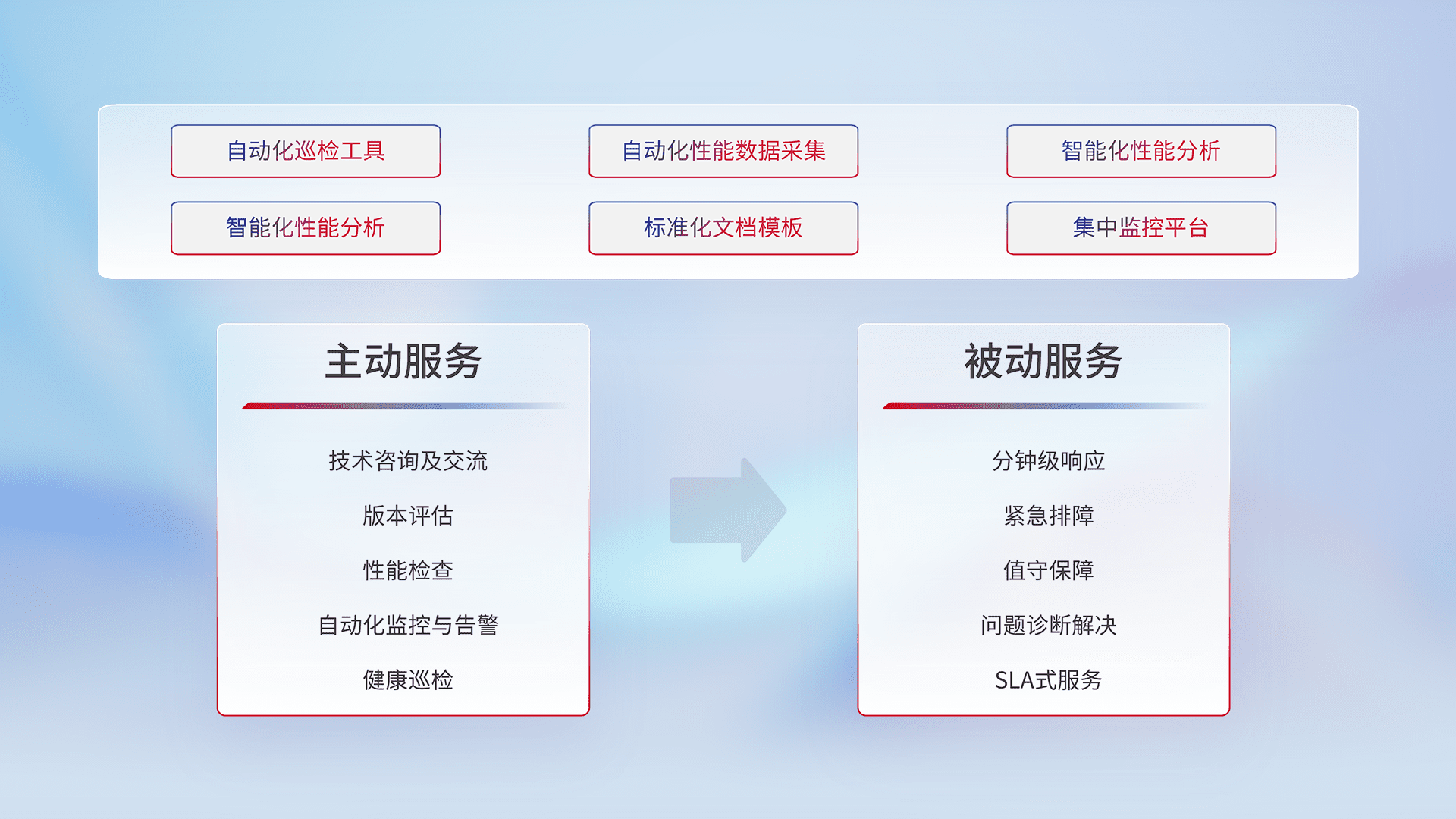 智能化工具和标准化文档,,,保障服务质量,,,提供主动服务(包含技术咨询、、、、版本评估、、、、性能检查、、自动化监控与告警、、健康巡检)和被动服务包含(分钟级响应、、、紧急排障、、、值守保障、、、问题诊断解决、、、、SLA服务)。。。。