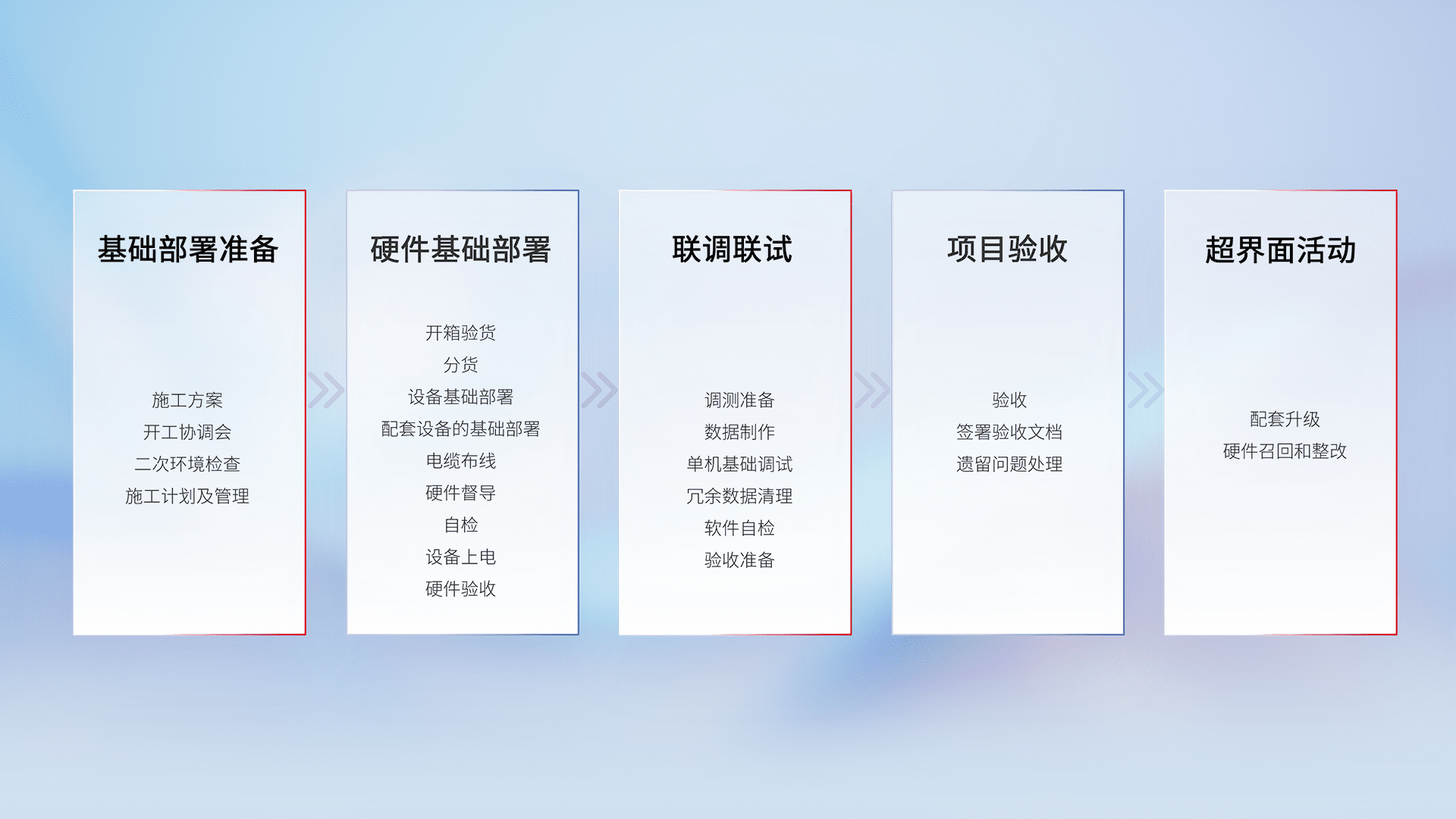 从基础部署准备、、、、硬件基础部署、、联调联试、、、、项目验收、、、、越界面活动的全过程可追溯,,,保证施工质量和进度。。。